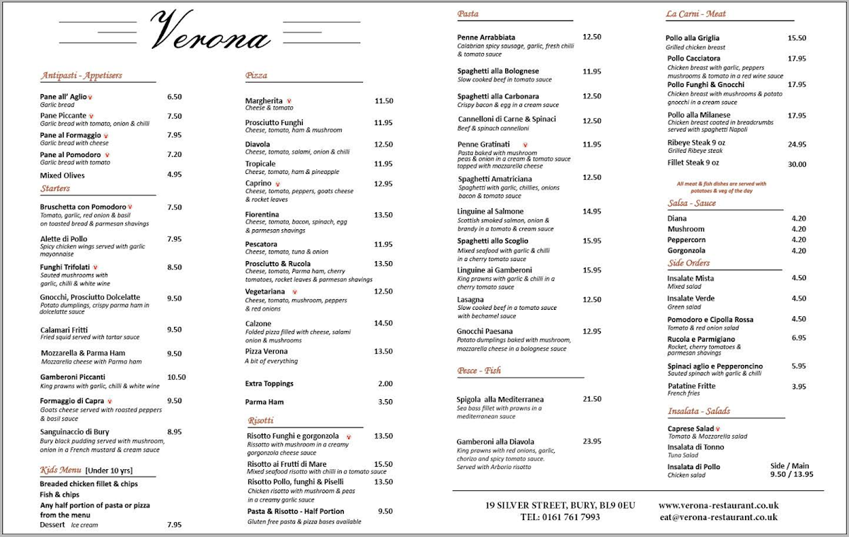 Welcome to Verona, a delightful culinary gem nestled in Bury, United Kingdom. This charming restaurant boasts a menu that truly celebrates Italian flavors, featuring an array of carefully crafted dishes. Begin your meal with scrumptious starters like the Bruschetta con Pomodoro or the tantalizing Gnocchi, Prosciutto Dolcelatte—a creamy delight that leaves a lasting impression.